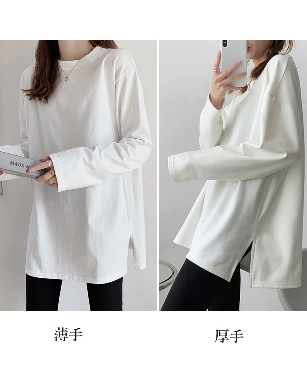 暖かい サイドスリットTシャツ ゆったり ドロップショルダートップス 無地長袖白Tシャツ 韓国風カットソー 着回し春秋冬