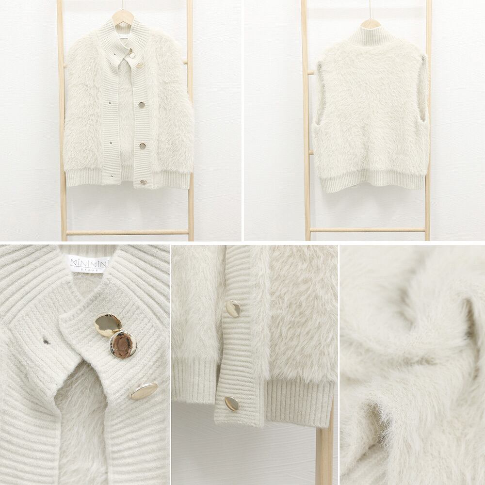 韓国 ファージレ きれいめ スタンドカラーファージャケット 袖なしファーカーディガン 秋冬 ニットアウター 羽織り着やせ