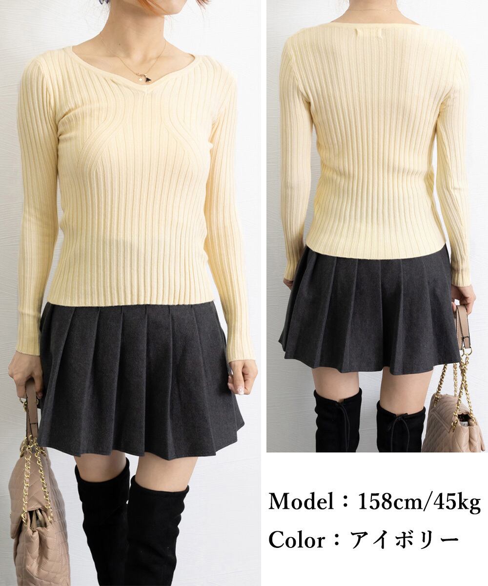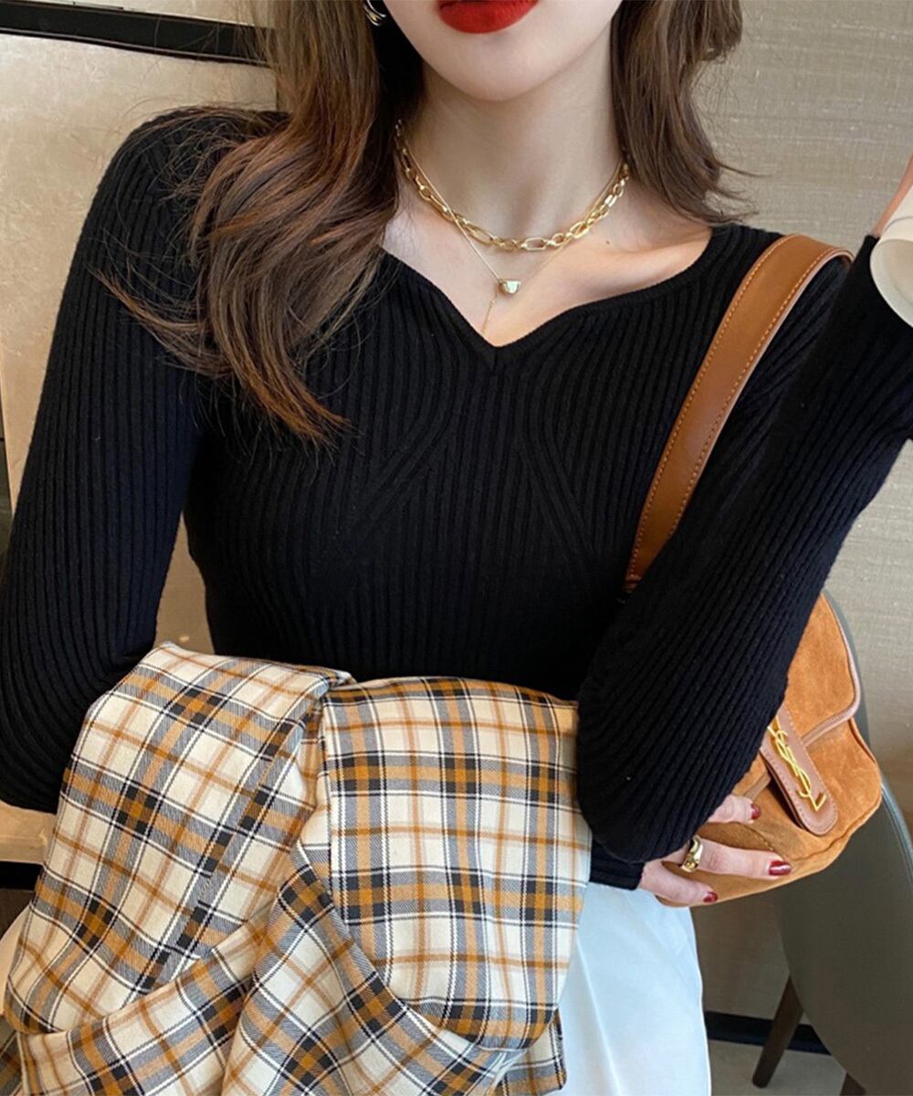 ハートネックで首元がすっきり綺麗に見える長袖タイトニットトップス