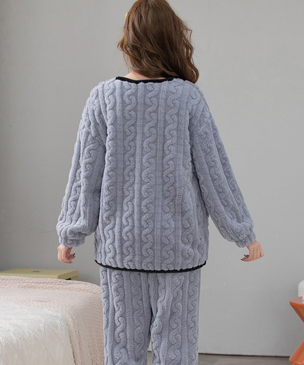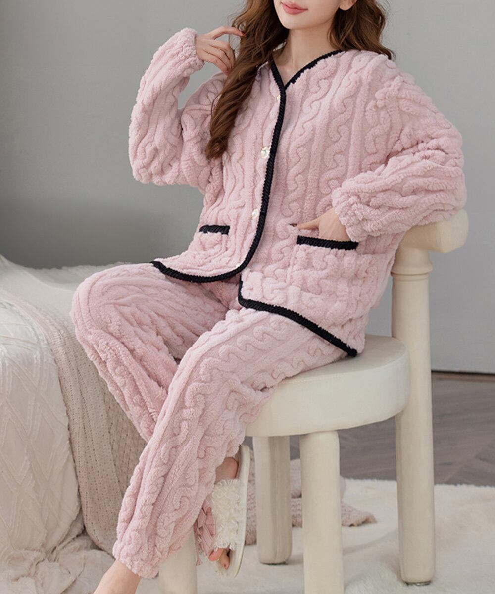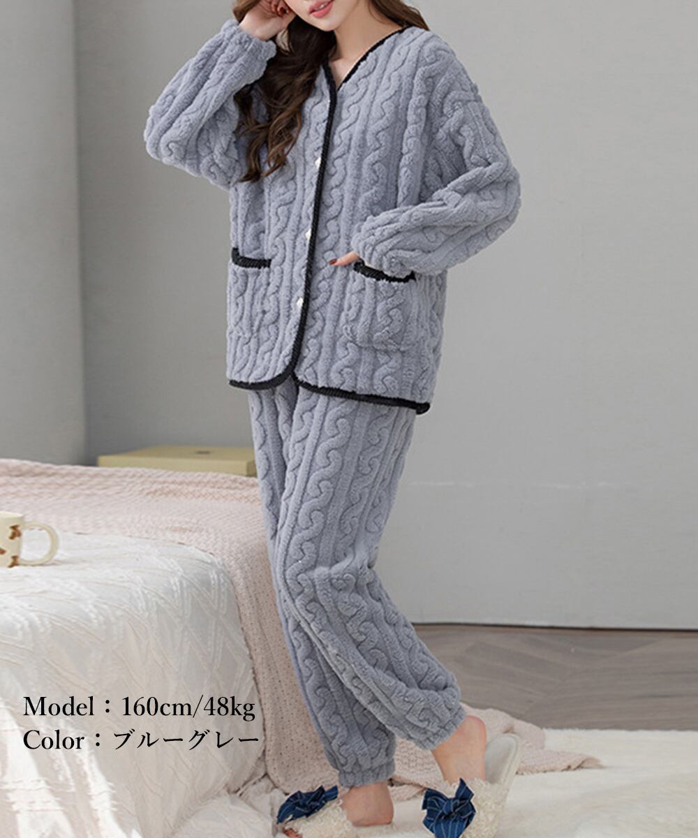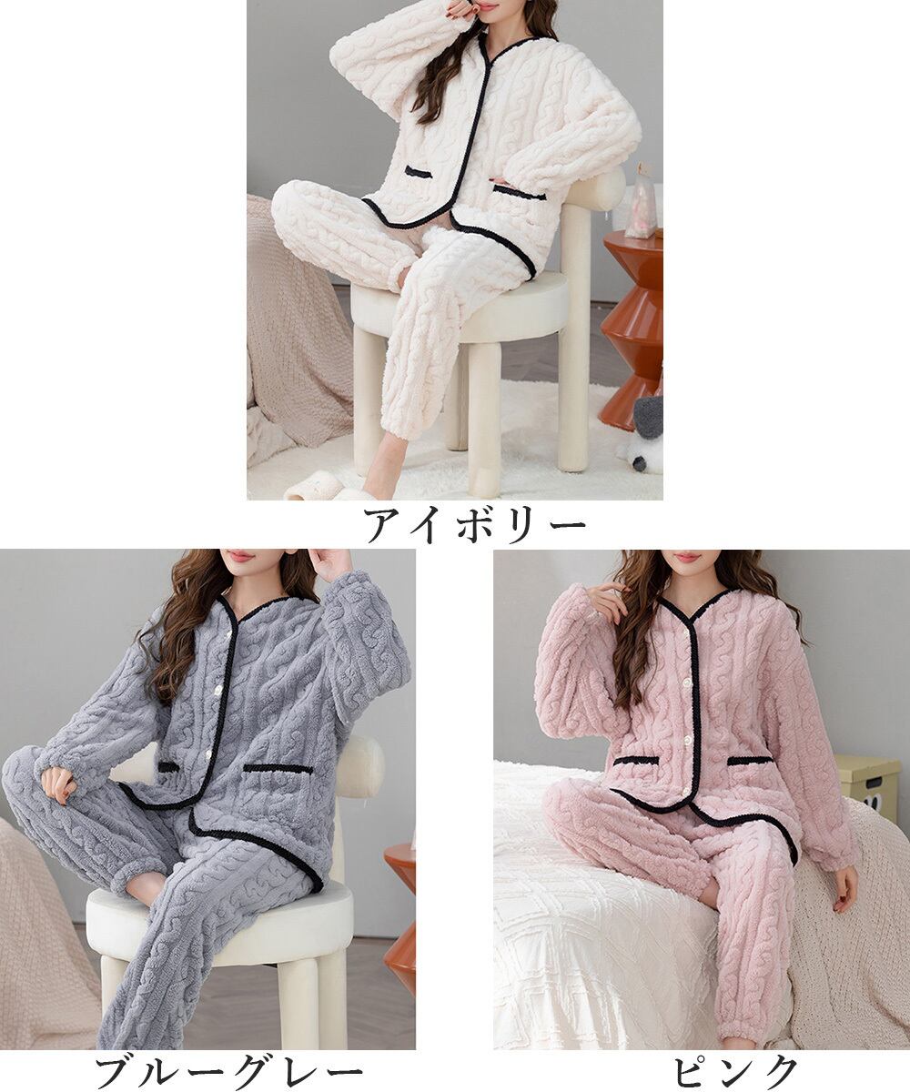 ケーブル柄ルームウェア セットアップ ポケット付き ふわふわ部屋着 軽く暖かい 長袖寝巻き もこもこボアパジャマ 冬防寒