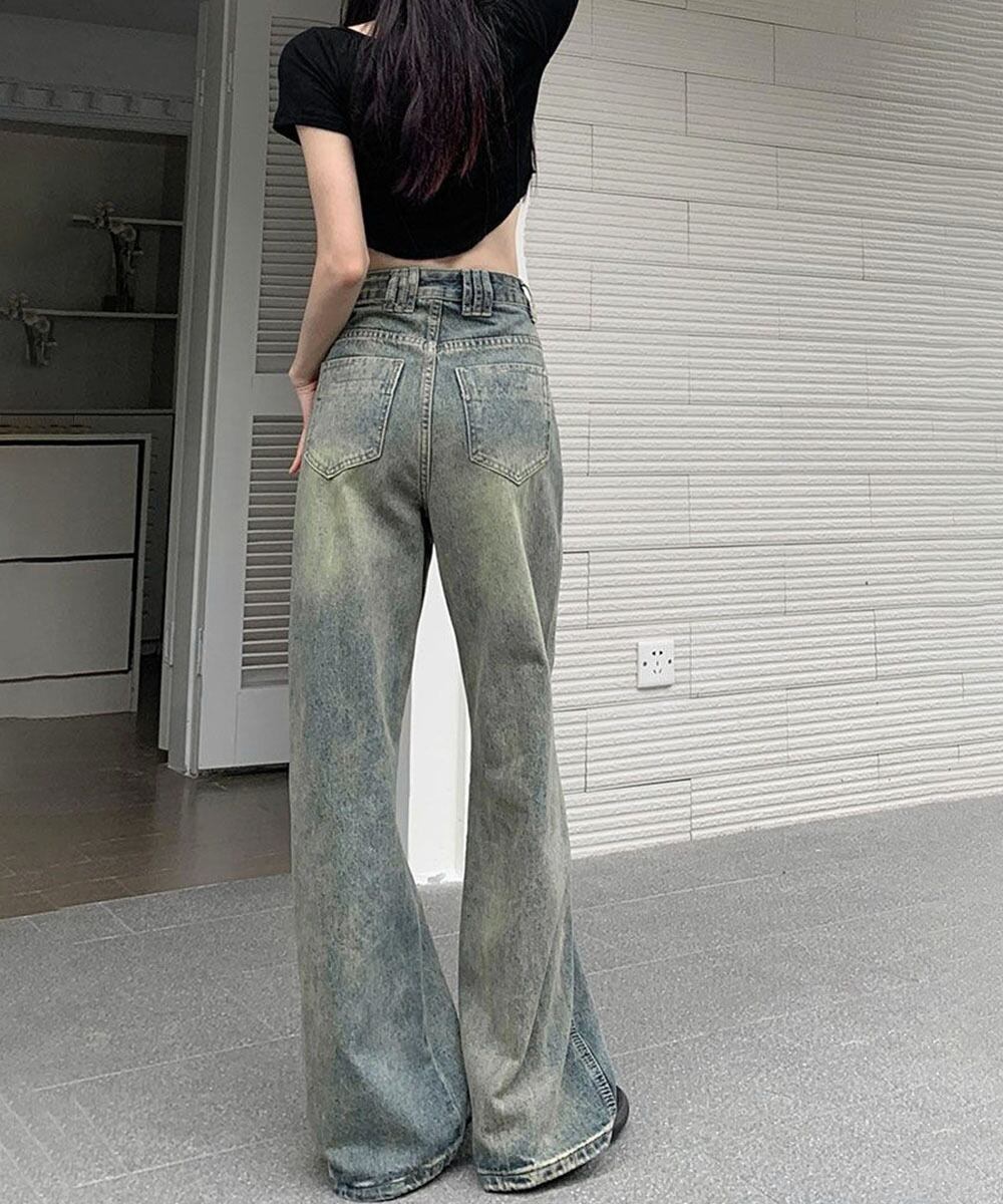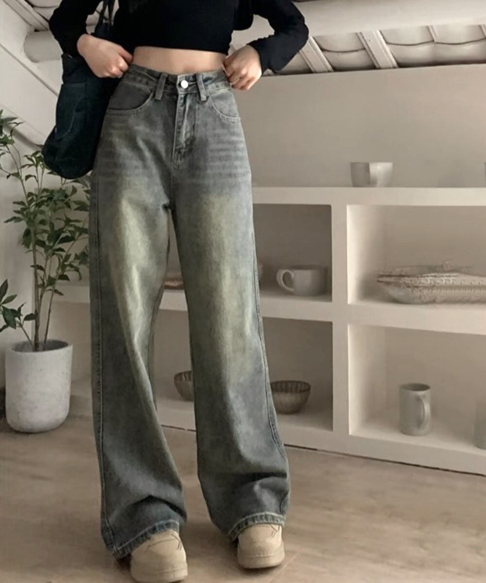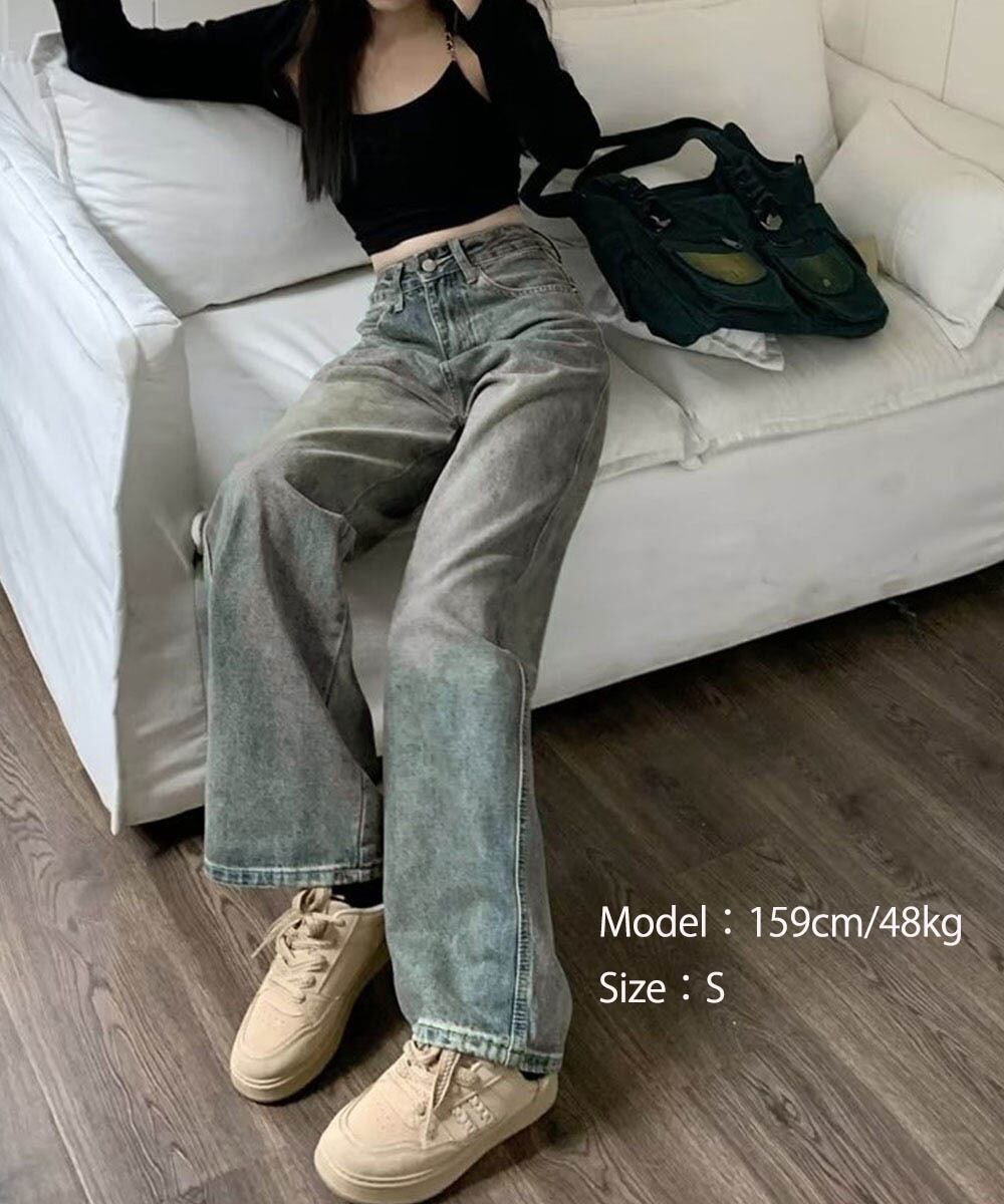 レトロ風ジーンズ ハイウエスト ウォッシュデニム 美脚脚長 セミワイドパンツ フルレングス 着やせジーパン 体型カバー