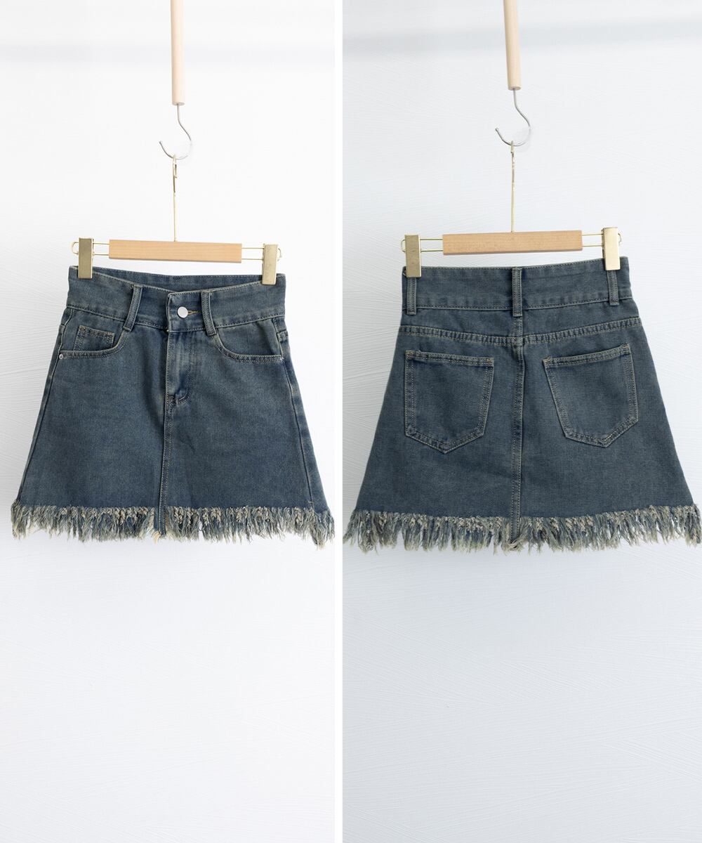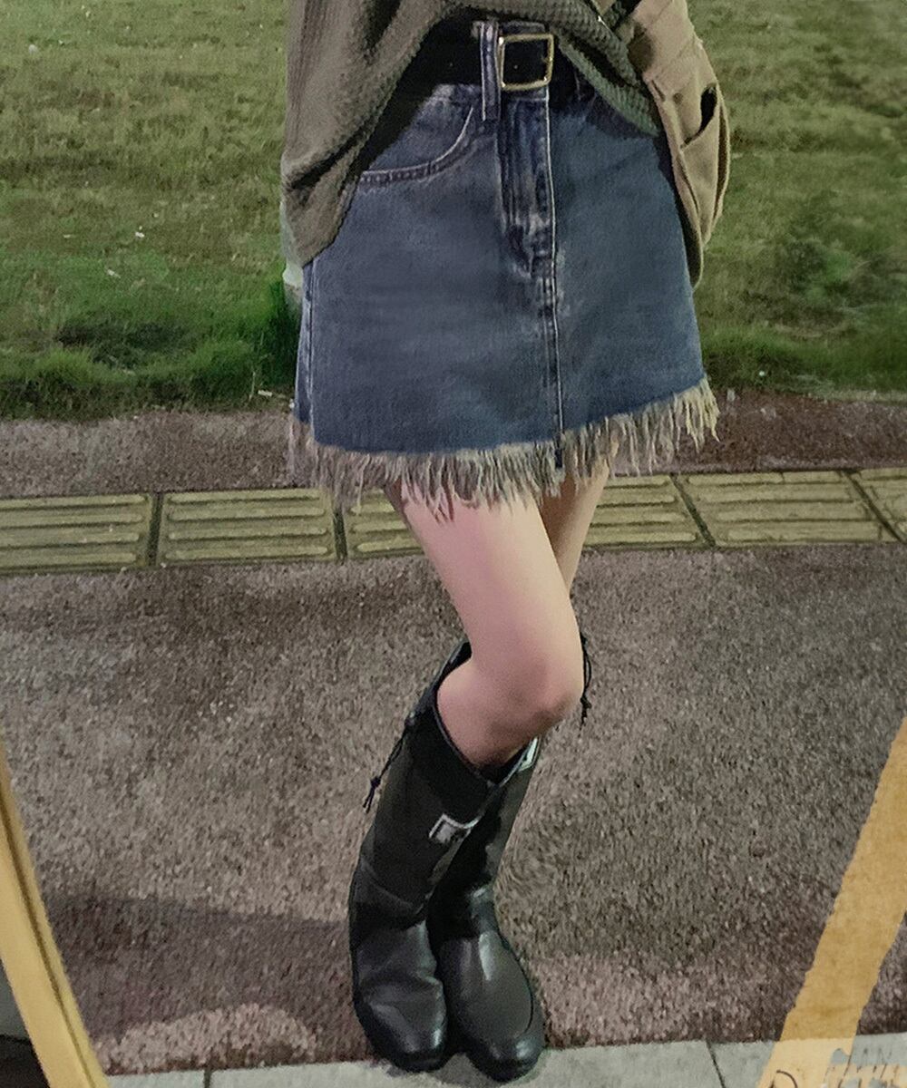 裾フリンジ デニムスカート ハイウエスト