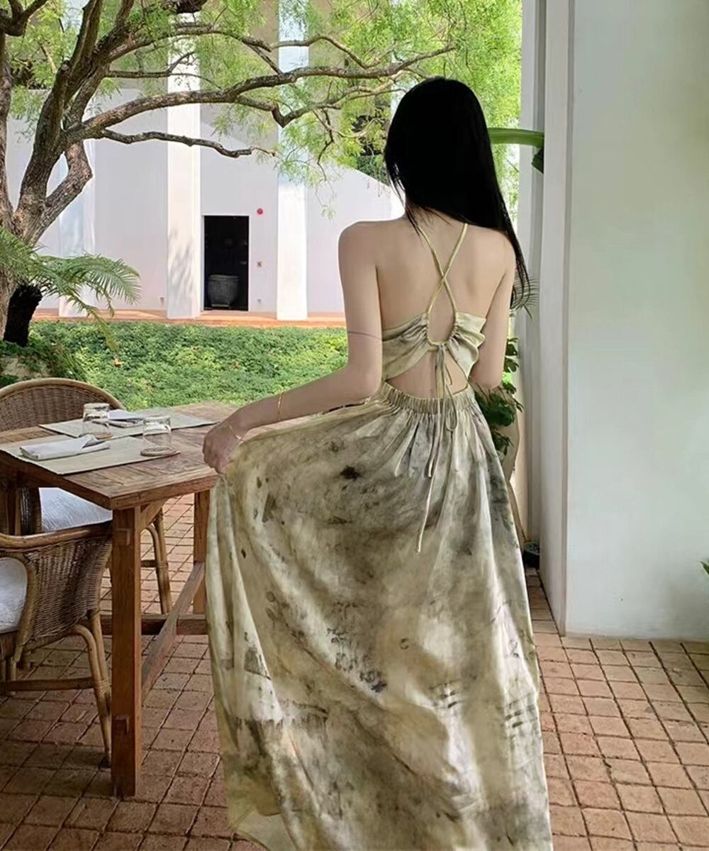 リゾートワンピース レディース バックオープン ロングワンピ体型カバー Vネック タイダイ柄ワンピース ハイウエスト旅行