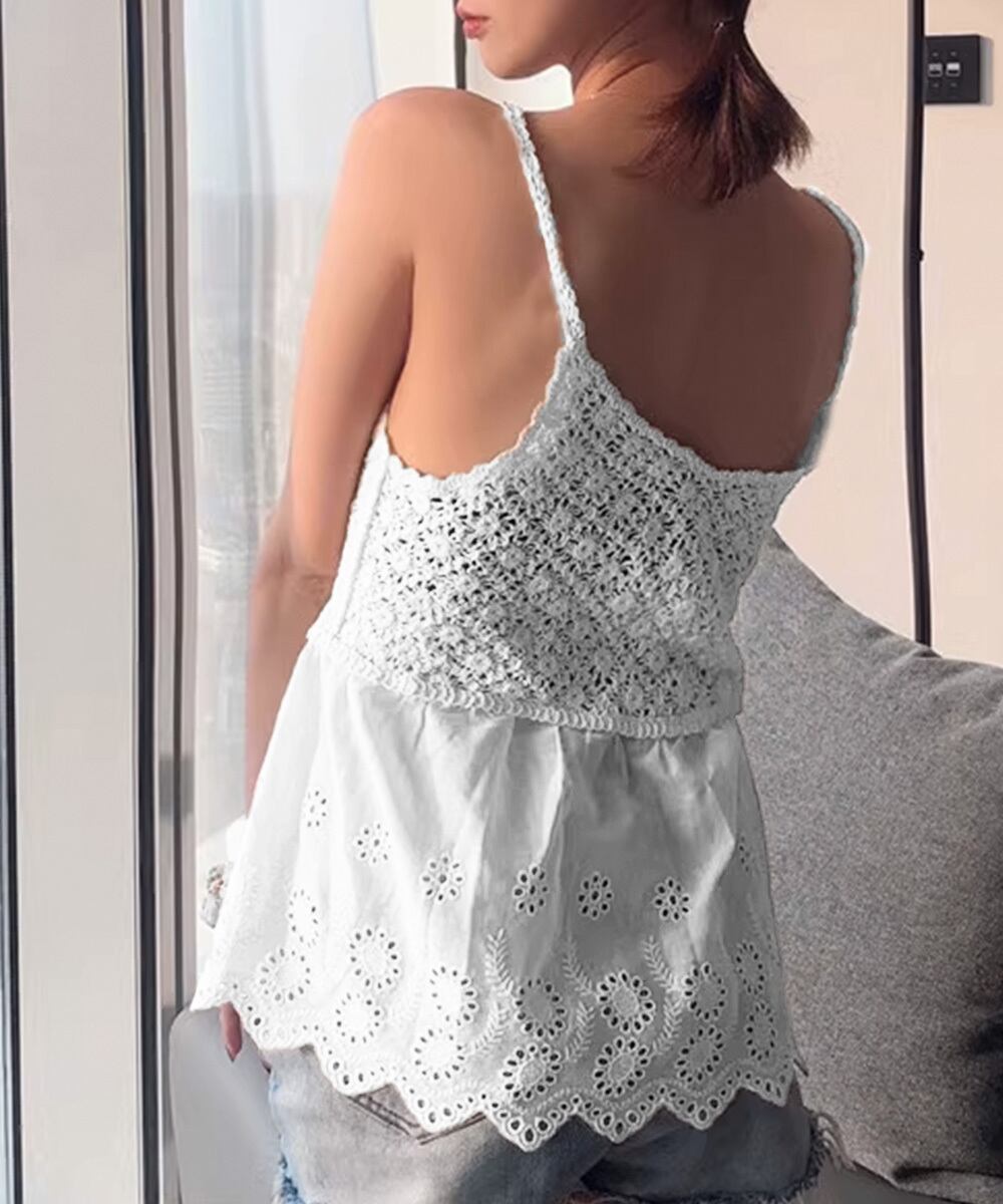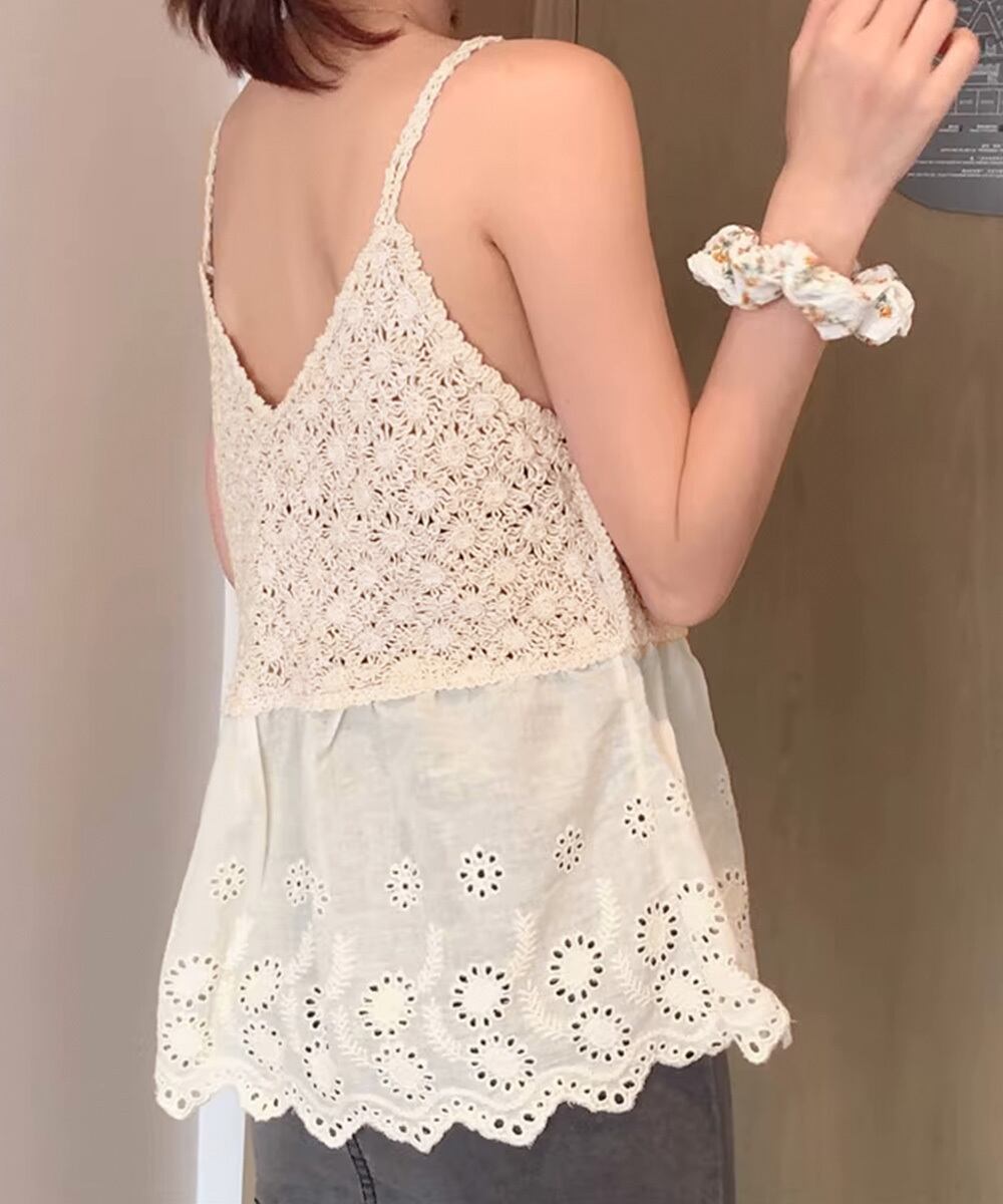 レディース クロシェ編みニットキャミ 切り替え ノースリーブ サマーコーデ 肌見せ 大人可愛い カジュアル 薄手トップス