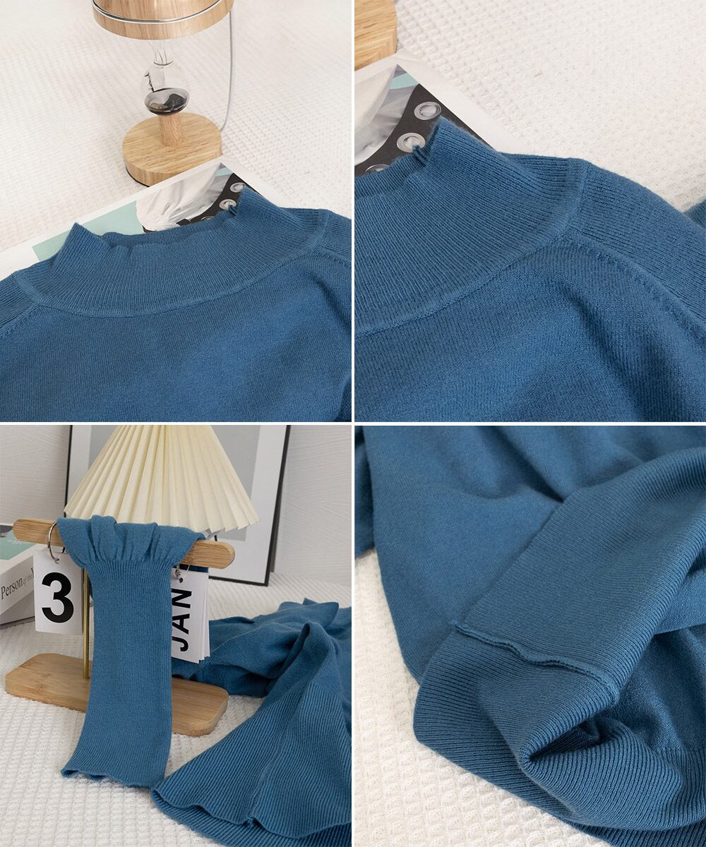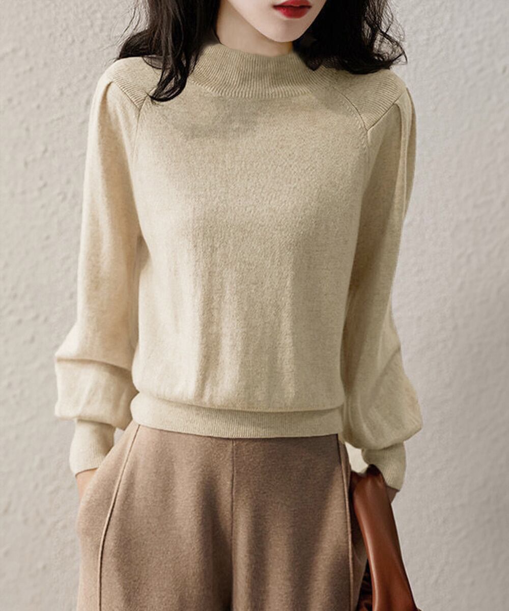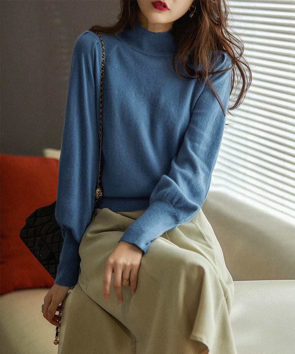 首元を包み込むプチハイネック仕様で、シンプルながらもエレガントな印象を演出するニットトップスです