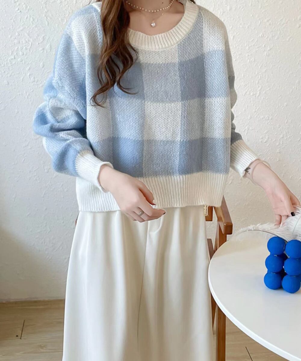 ブロックチェック 韓国風 ニット ラウンドネック プルーオーバー ニットトップス 通学 ニットソー 大人カジュアル