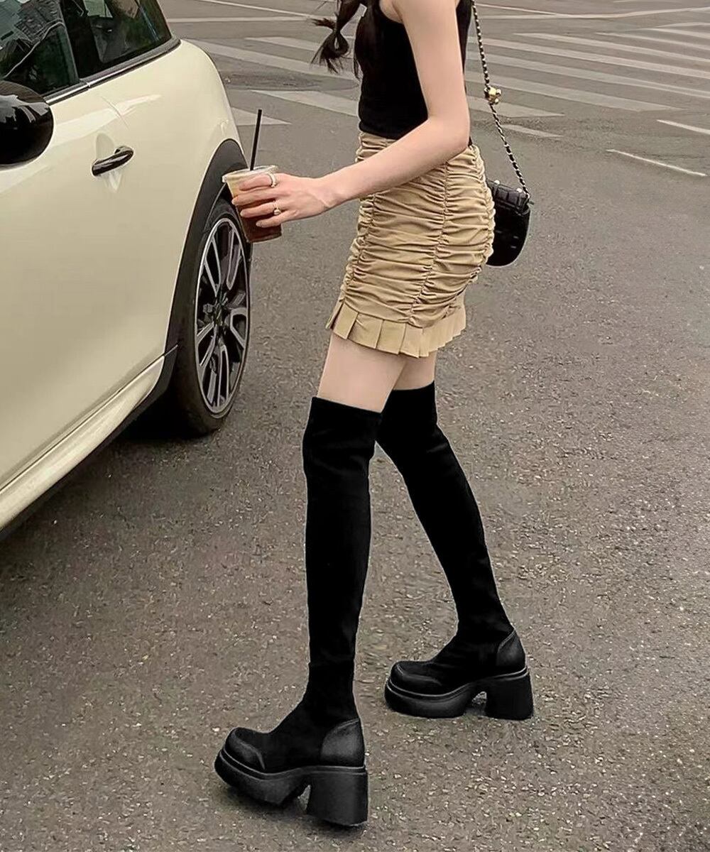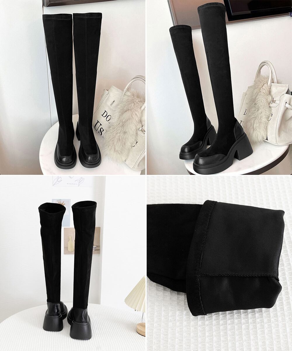 スクエアトゥ 厚底 ジョッキーブーツ 履きやすい膝上ブーツ 美脚脚長ストレッチブーツ大人きれいめ 太ヒールフィットブーツ