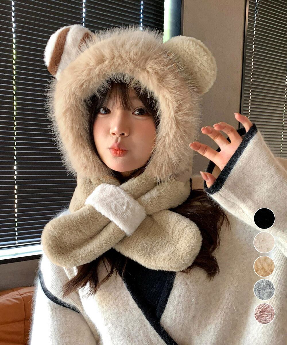 レディースくま耳帽子 秋冬 ボア帽子 マフラー帽子 大人可愛いアニマル帽子 あったかグッズ 女性 プレゼント 防寒グッズ