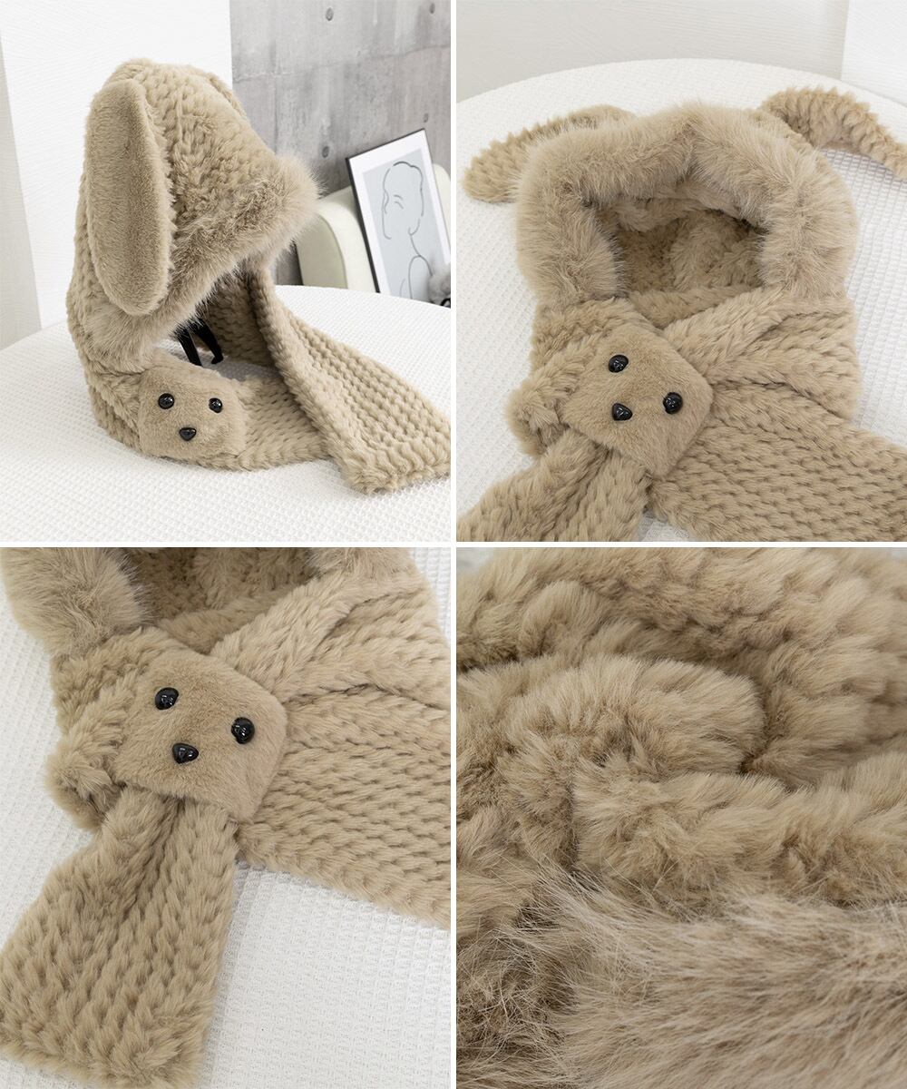 可愛らしいうさぎ耳の帽子とマフラーが一体となったレディース用ファー帽子